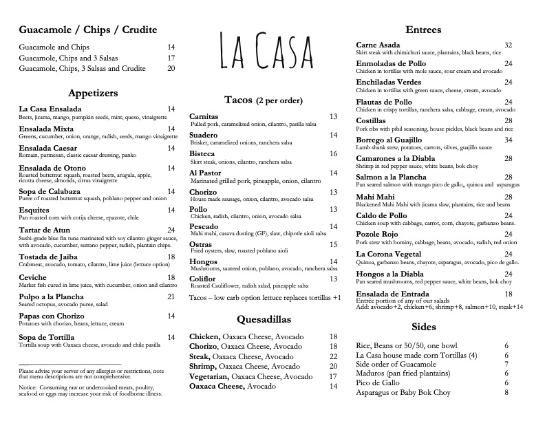 Guacamole made with avocado, cilantro, onion, lime, serrano pepper, sea salt. Chips made from corn, canola oil, and sea salt. 3 Salsas: Tomatillo (green tomato, cilantro, serrano pepper), Macha (peanuts, pistachios, sesame seeds, chiles), Ranchera (tomato,garlic,onion,serrano) Crudite - carrots, celery, bell peppers, jicama